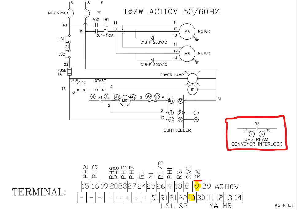 The BP_PLC control panel has a normally-open dry contact on Relay#2 (R2) for signaling the upstream to release a box. The dry contact is broken out to wire numbers 9 & 10 which are landed at the terminal blocks for field wiring. When the machine is ready for a box, R2 will activate and the dry contact closes. When the machine is faulted, stopped, or busy, R2 drops out. The exact behavior of the upstream interlock can be modified in the DAS configuration settings to either toggle the upstream every box cycle or only turn off if the machine faulted.