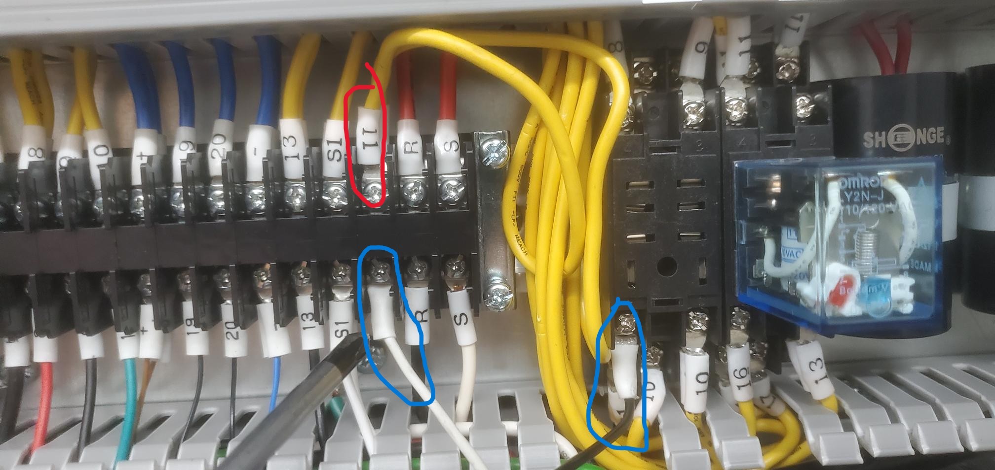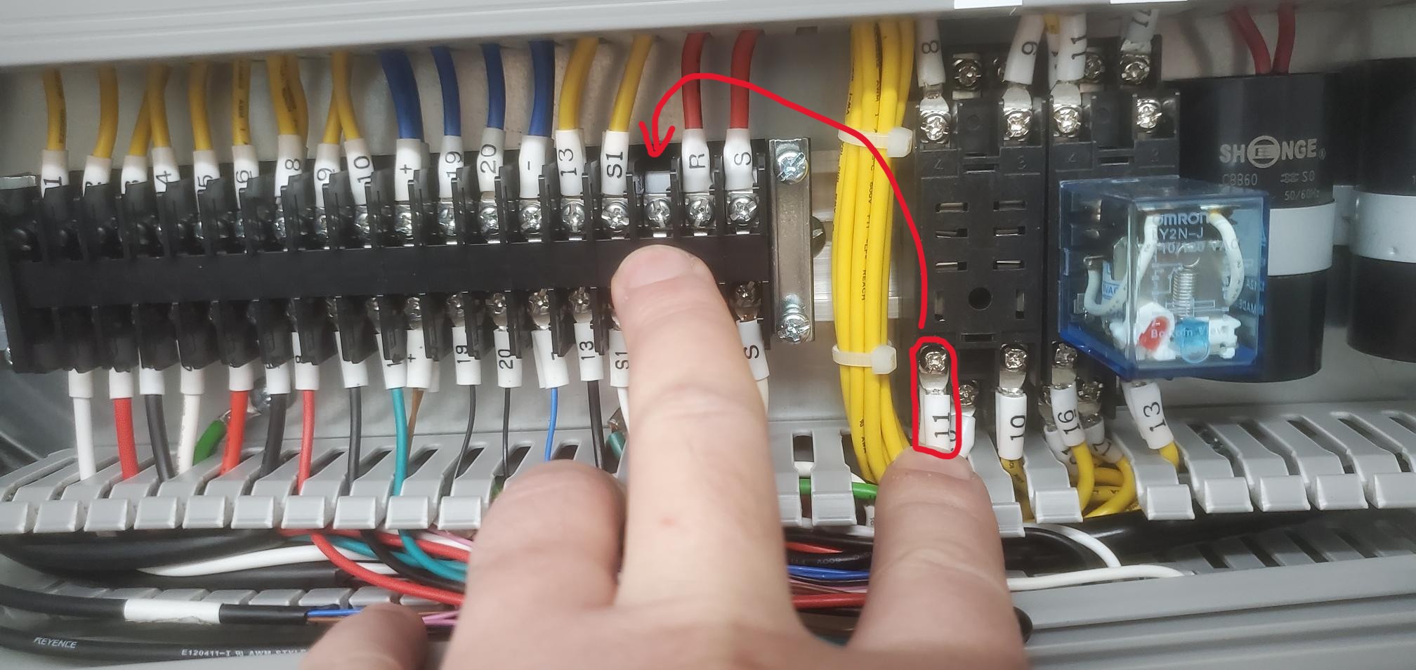 Once #11 are moved, the other end of the 2C cable can be landed where the #11's used to be on R1, and at #11 new terminal location. After:
